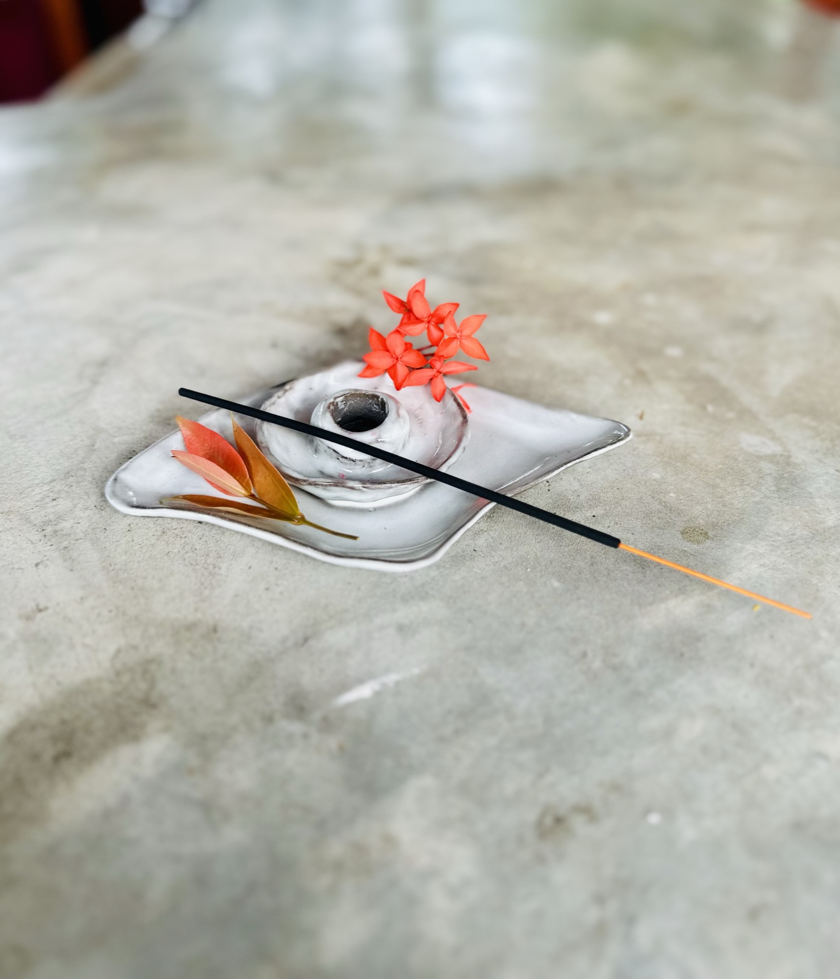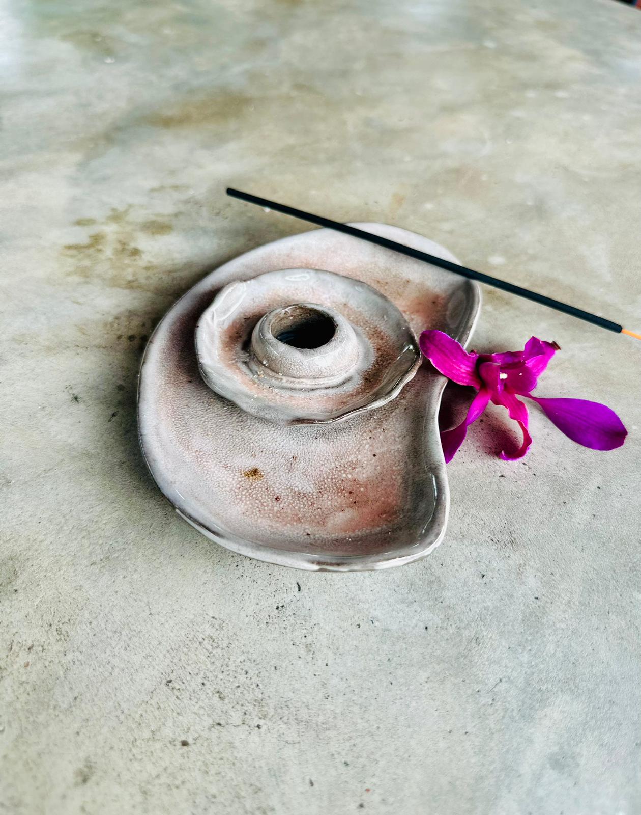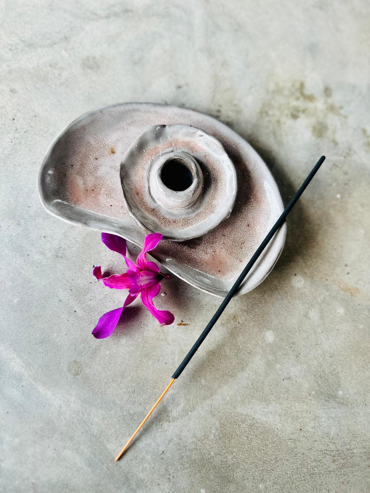 Wunderschöne, handgemachter 3-in-1 Räucher-und Kerzenhalter aus der künstlerischen Hand von unserer Keramikkünstlerin Kata. Einsetzbar für Palo Santo, Kerzen und Räucherstäbchen zugleich. Mit einem extra Loch und einer extra Auffangschale für ein Räucherstäbchen. Ritualgegenstände finden in seiner weiträumigen Schüssel Platz.